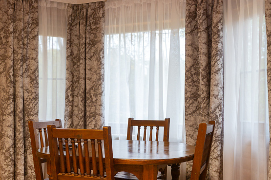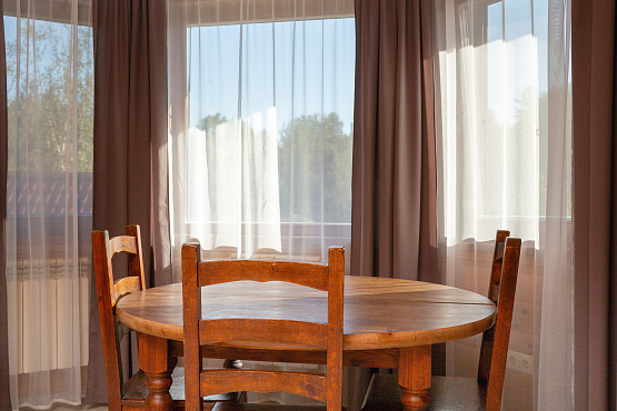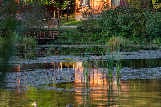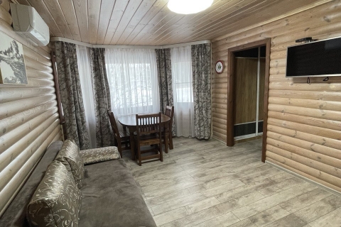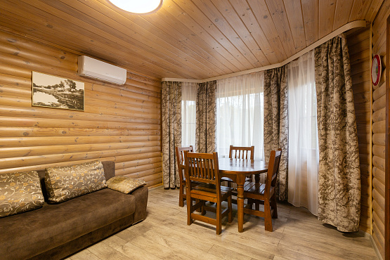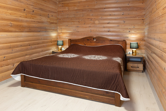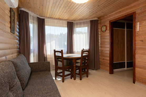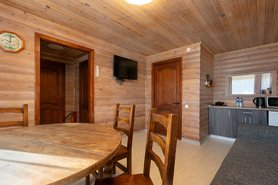 Шале на внутреннем озере двухкомнатное — одноэтажные коттеджи № 26, 27, 28, 29, 30 - расположены на удалении от главной аллеи, находятся около внутреннего озера, что обеспечивает уединенность, великолепные виды и уютную атмосферу. Каждый коттедж имеет террасу, обустроенную массивной деревянной мебелью для отдыха на свежем воздухе. Современная стилистика данных домиков отличается от остальной инфраструктуры острова, но это только снаружи. Внутри сохранена неповторимая атмосфера, которую может подарить только натуральное дерево. Общая площадь каждого номера – 50 квадратных метров, на которых располагаются гостиная с мягкой мебелью (раскладной диван), спальня с большой двуспальной кроватью, тумбочками и ванная комната. В коттедже есть телевизор, холодильник, СВЧ, электрочайник, набор посуды. Ванная комната оборудована душевой кабиной, раковиной и унитазом. Шале на внутреннем озере – комфортный отдых для семьи или небольшой компании.